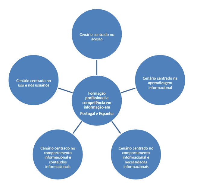 Figura 1: O cenário possível da formação do profissional da informação em Portugal e Espanha e a competência em informação na atualidade Fonte: dados obtidos na pesquisa Também sob o foco da mediação, Silva (2008) pondera que é impossível desligar o alastramento globalizado das TIC, das habilidades técnico-cognitivas exigidas pelo seu uso Formação profissional e competência em informação em Portugal e Espanha Cenário centrado no acesso Cenário centrado na aprendizagem informacional Cenário centrado no comportamento informacional e necessidades informacionais Cenário centrado no comportamento informacional e conteúdos informacionais Cenário centrado no uso e nos usuários